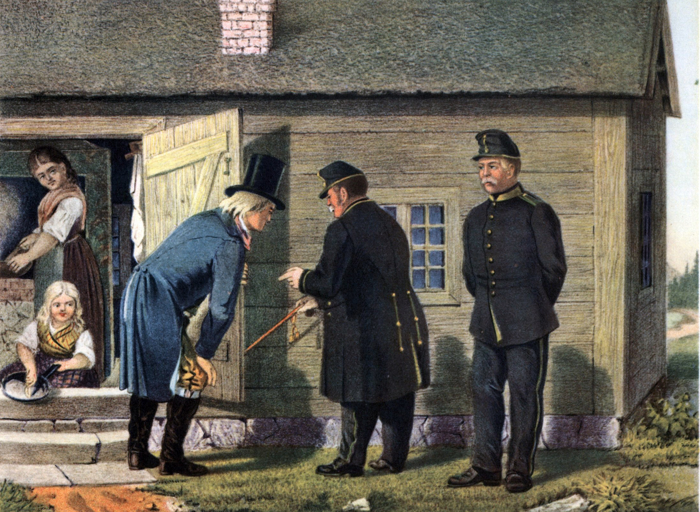 Torpbesiktning. Färglitografi av Viktor Ludvig Emmanuel Sparre 1866. Bildkälla Wikimedia Commons